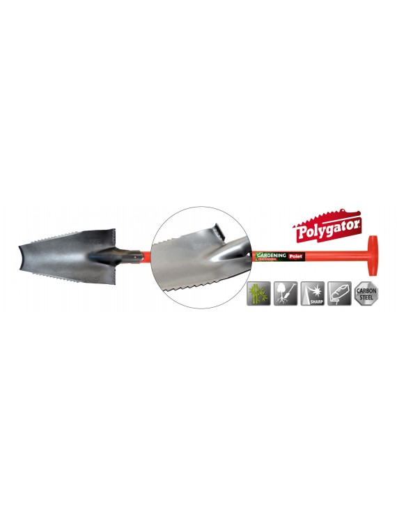 Bêche à dents fibre. Manche fibre 5001. fer de bêche de 38 cm de haut, bords dentelés. Epaisseur du fer 3 mm en acier extra-trempé. 2 repose-pieds soudés. Manche fibre 5001 en T de 85 cm. Garantie de 10 ans sur le fer de bêche.